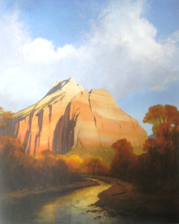 A new exhibit opened tonight at the St. George Art Museum, featuring the stunning paintings of Jimmie Jones, as well as paintings by Margaret LaFranc and a unique installation called “Upside Down.” Deborah Reeder and her staff at the museum put together another outstanding exhibit. As a landscape painter, I am always drawn to good landscapes, but Jim Jones is in a league by himself. Painting from his hand-built studio, high on a rocky ridge near Zion National Park, Jones has spent a lifetime putting his own stamp on images of the southern Utah terrain. This show contains many new pieces created especially for Southern Utah University’s new art museum, along with numerous paintings from private collections. Filling the upstairs exhibit space, these landscapes literally take your breath away. Bigger-than-life images of the Grand Canyon and Zion National Park literally suck you in as sunlight and shadow dance magically across the canvases. Jimmie passed away in late 2009 leaving a legacy of over 400 paintings of Zion National Park and 150 of the Grand Canyon.