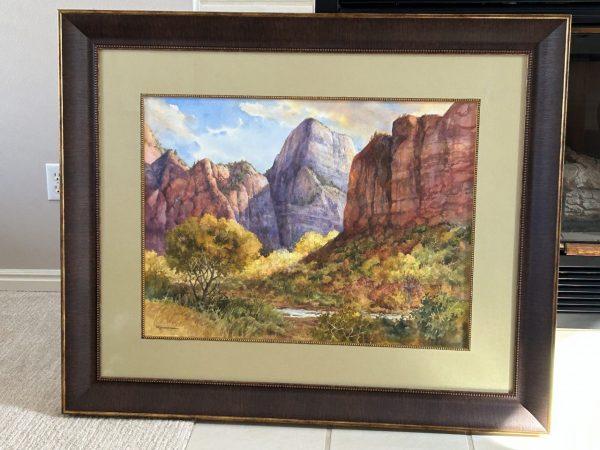 I am pleased to have this new big Zion watercolor painting back from the frame shop. It looks beautiful with its new frame, mats, and beaded filet. You can see it at my new home studio. “Zion’s Autumn Palette” 22 x 30 image size