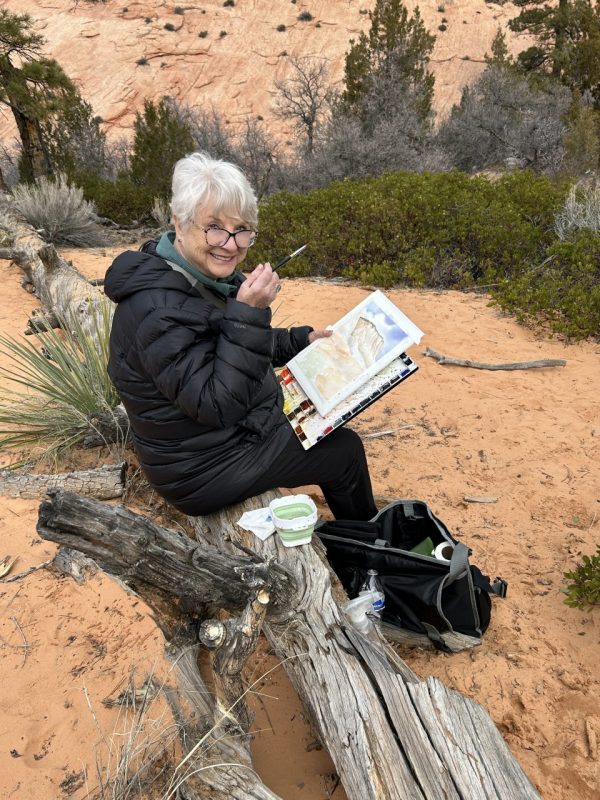 This winter is so mile we decided to go plein air painting in Zion National Park. The sun was shining and the park was nearly empty of tourists, so we just bundled up and enjoyed a very private outing with our watercolor paints. I was joined by Karen Bettilyon, Teresa Larson, Virginia Howard, and Jim Lee–all very capable artists. The sunshine made it perfect. We stayed at Virginia’s lovely home in Zion Ridge and painted three days.