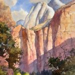Certainly one of Zion National Park’s best known features is The Great White Throne. I chose to paint the famous cliff face from the valley floor at Big Bend. The Autumn colors of yellows and golds resonate against the red and white cliffs above it. A perfect Autumn palette.